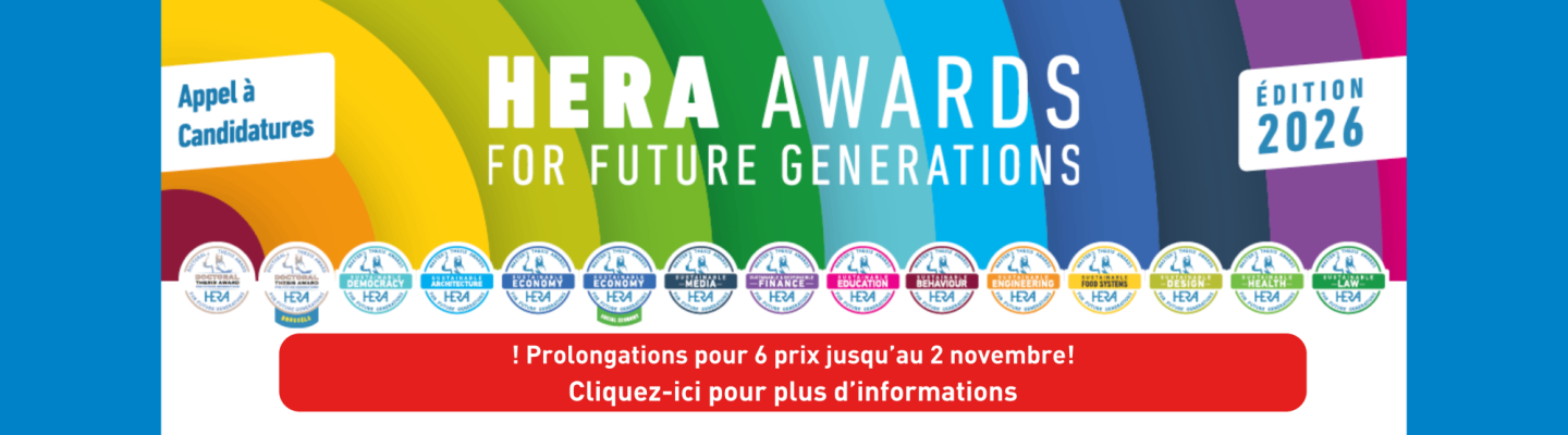 L'appel à candidatures aux HERA Awards 2026 est prolongé jusqu'au 2 novembre (inclus) pour certains prix !!! Plus d'infos sur la page "Awards".